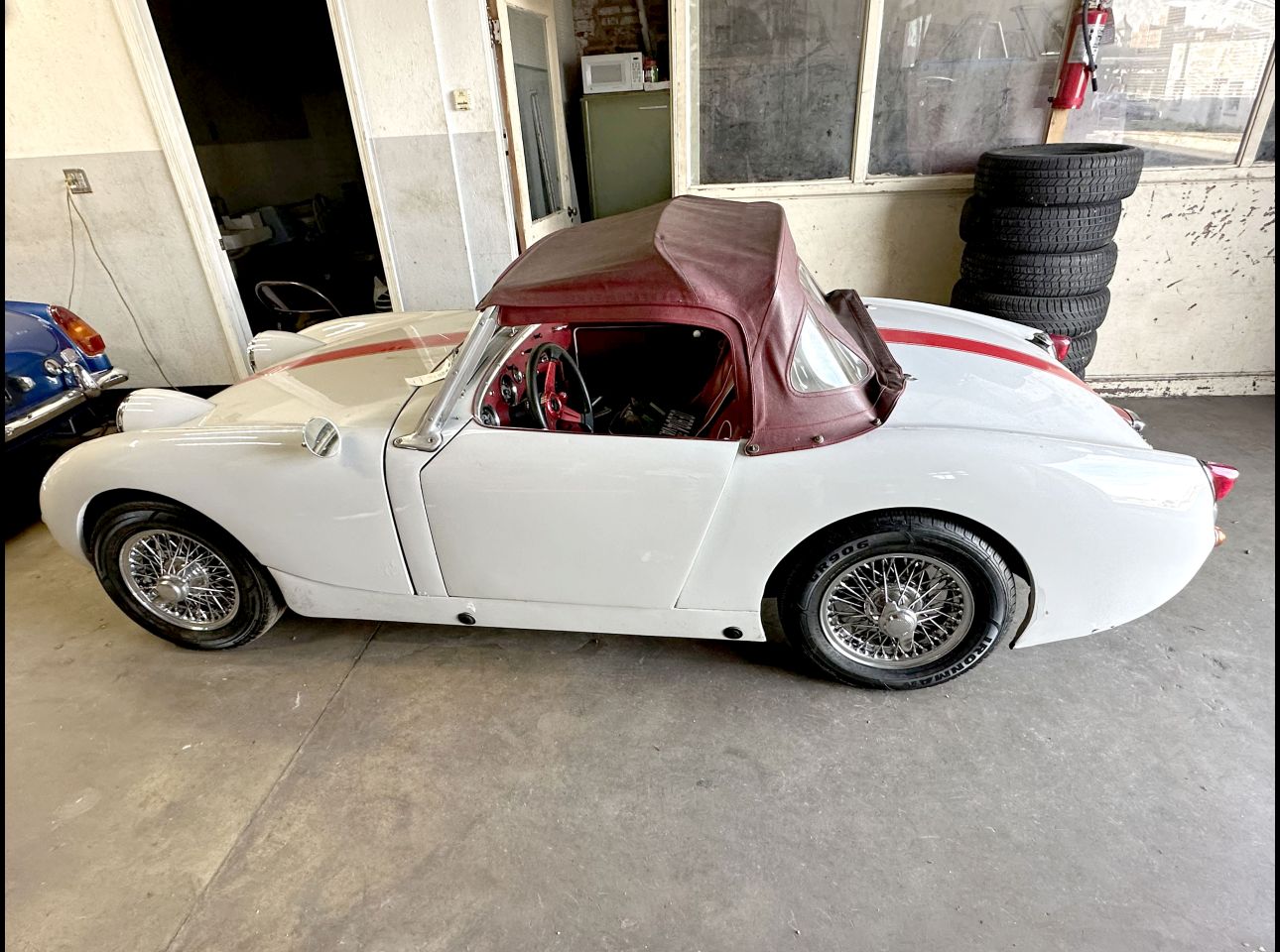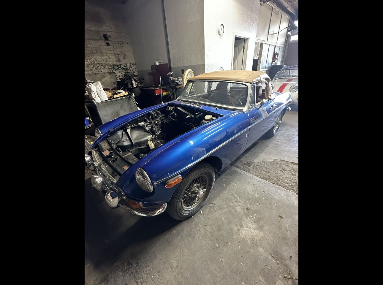 Blue MG in good condition showcasing a refined mocha interior. The vehicle includes its engine (not currently installed), providing an ideal project for enthusiasts looking to complete an authentic restoration. VIN: 346217. Located at the Salem Ave location.