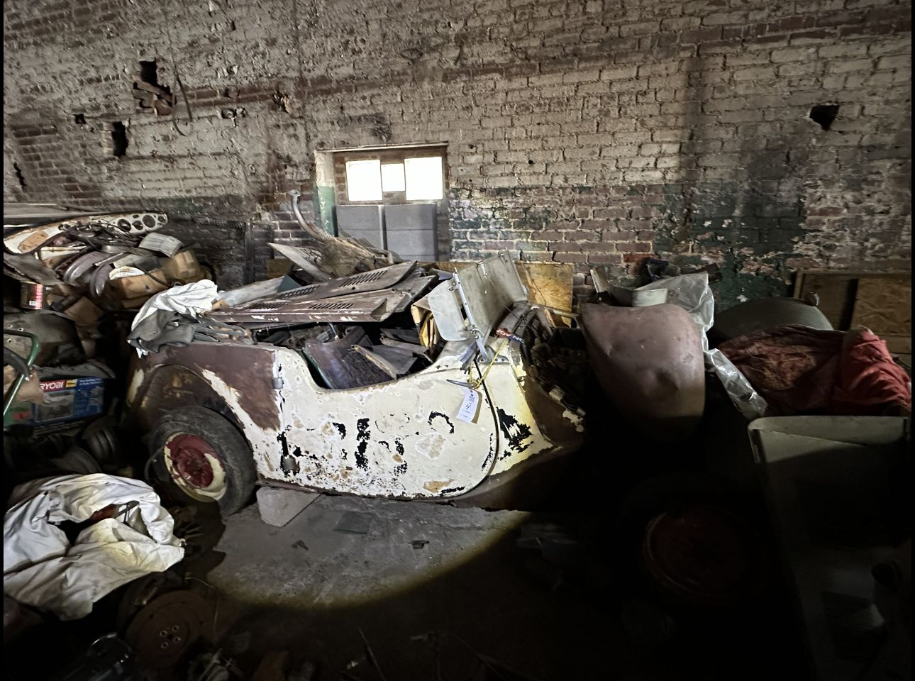 Vintage MGTD that was mid-restoration, including body panels, new tires, engine, and assorted components. Offers a solid starting point for a project or restoration. Majority of parts in garage. Located at the Salem Ave location.