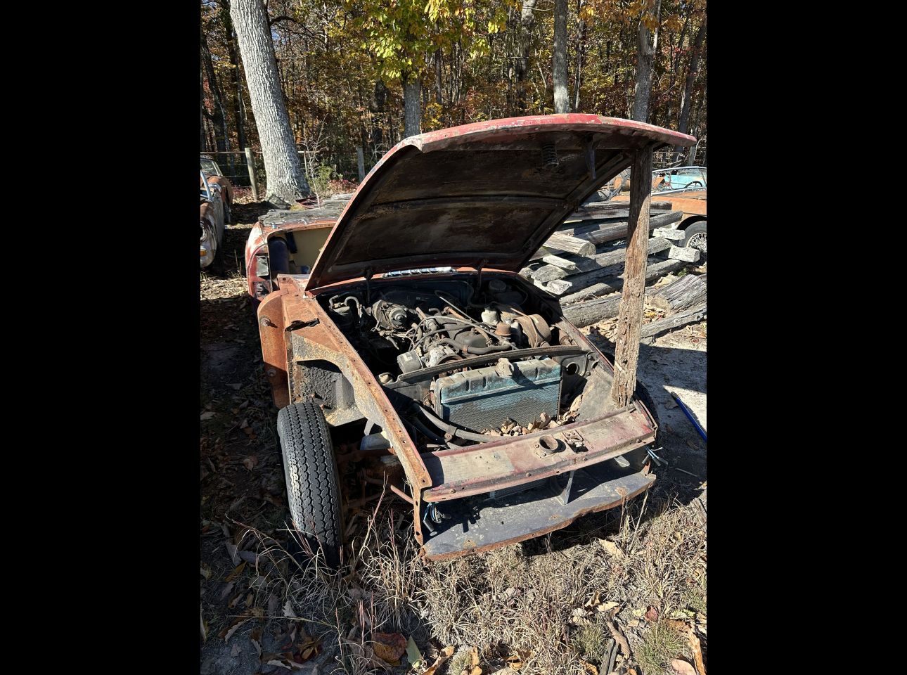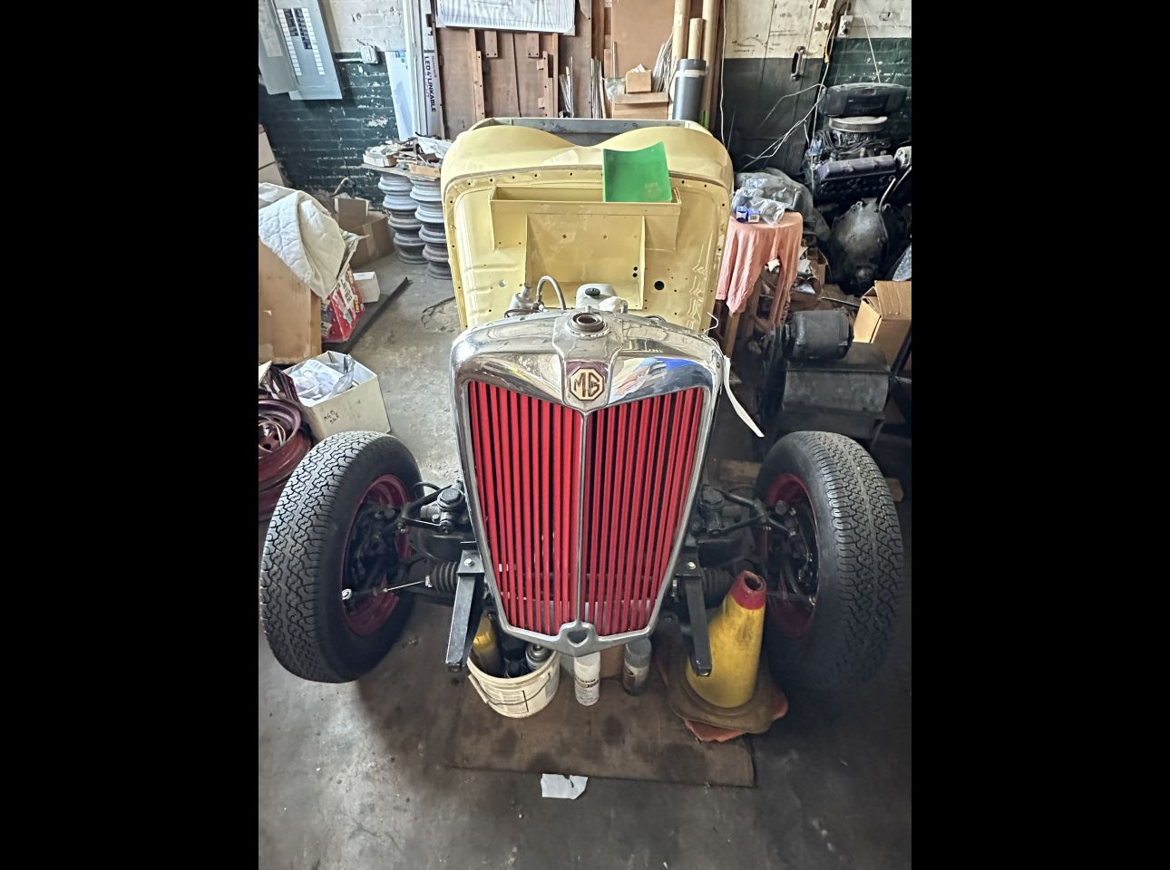 MGTF. Probably 1954-55. Frame has been painted. Appears (not guaranteed) to have had brake lines and some suspension work done as well as brake work done. It’s body parts are on Salem Ave with the other YT. Located at the Salem Ave location.