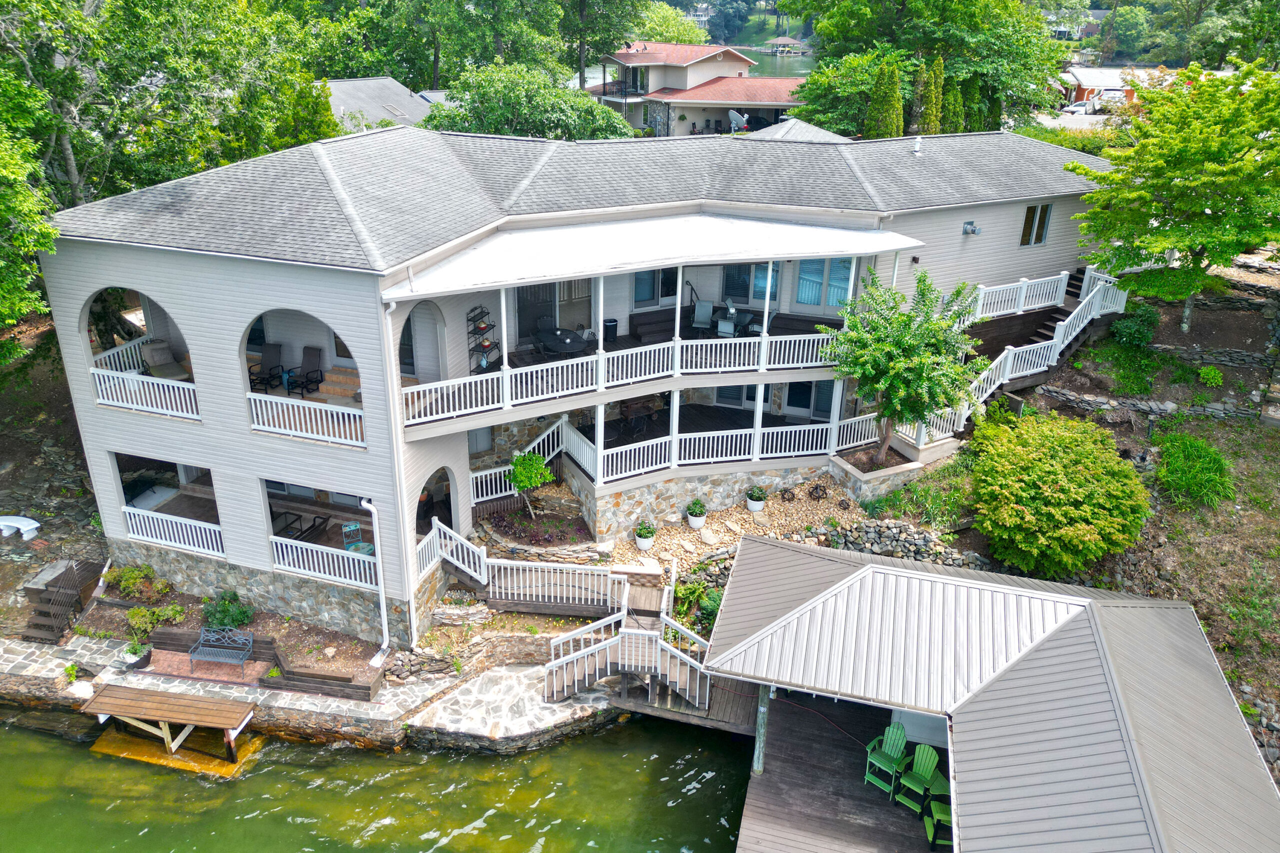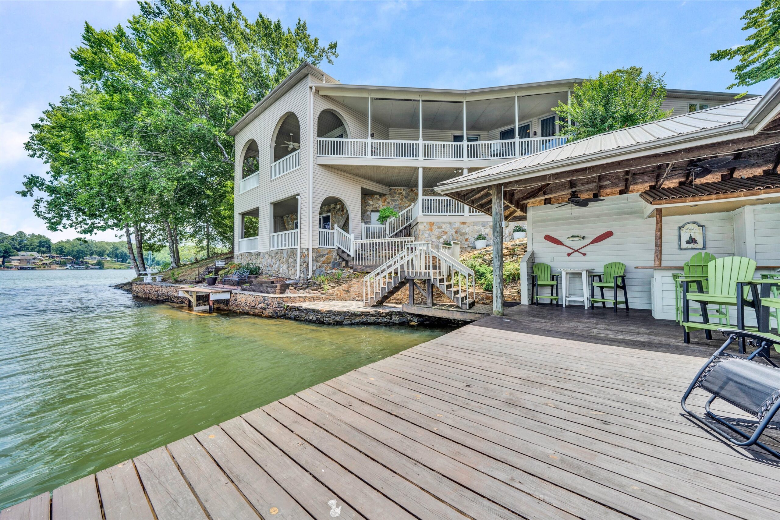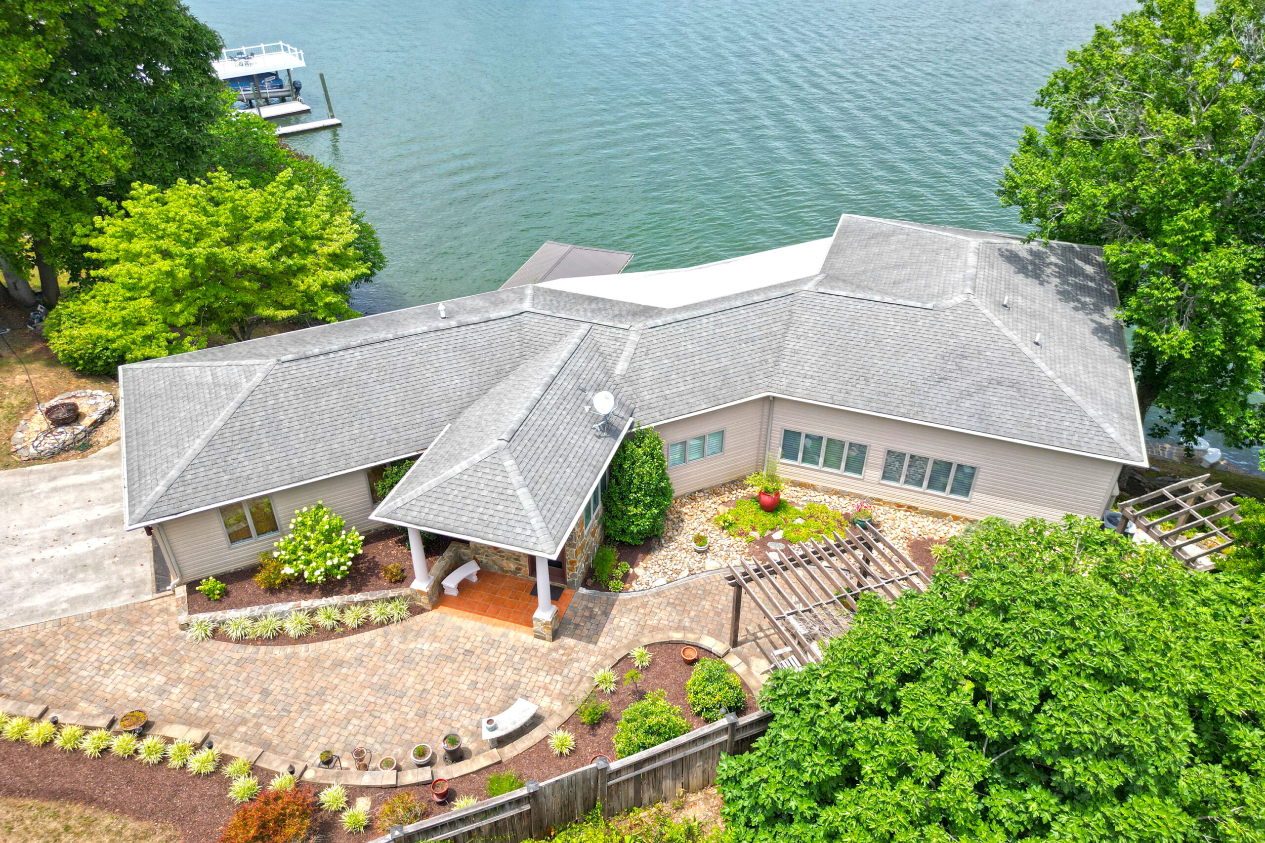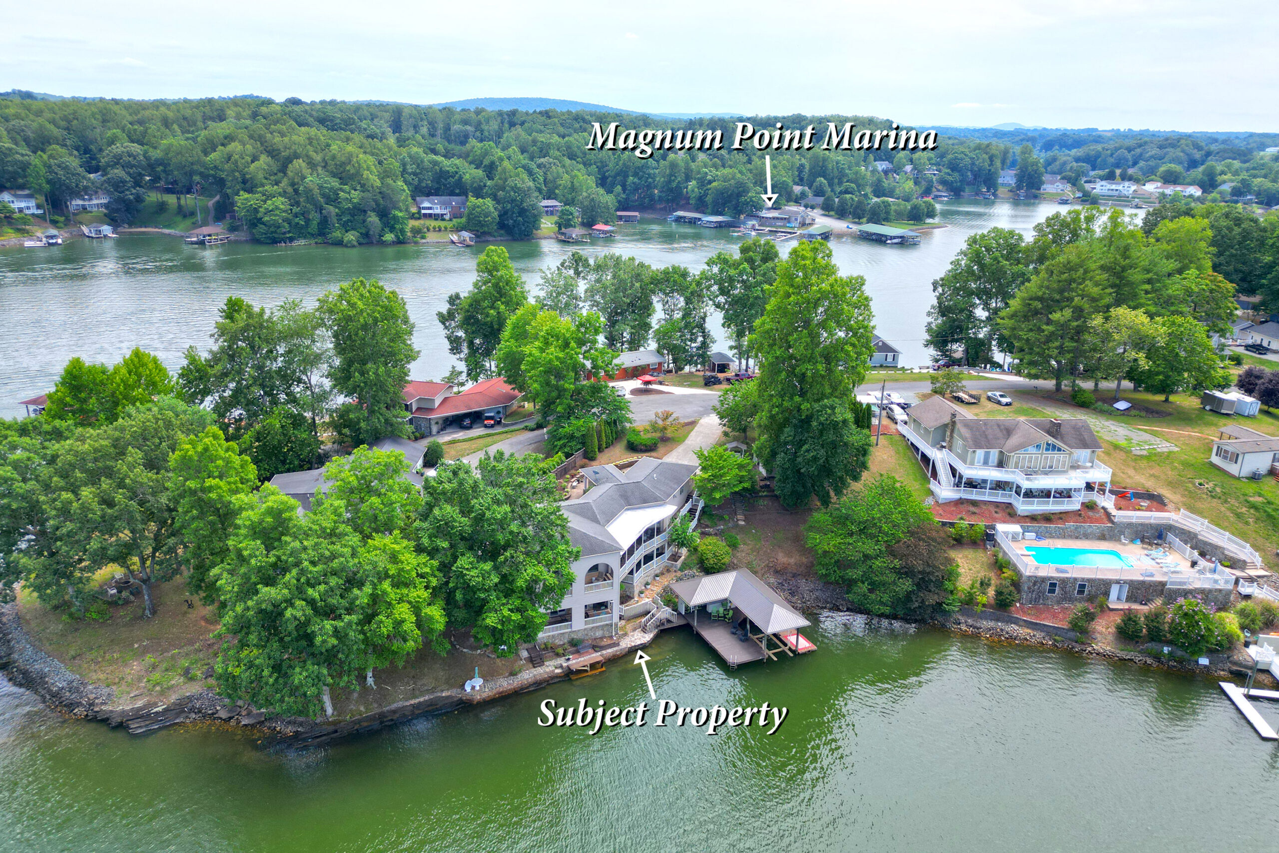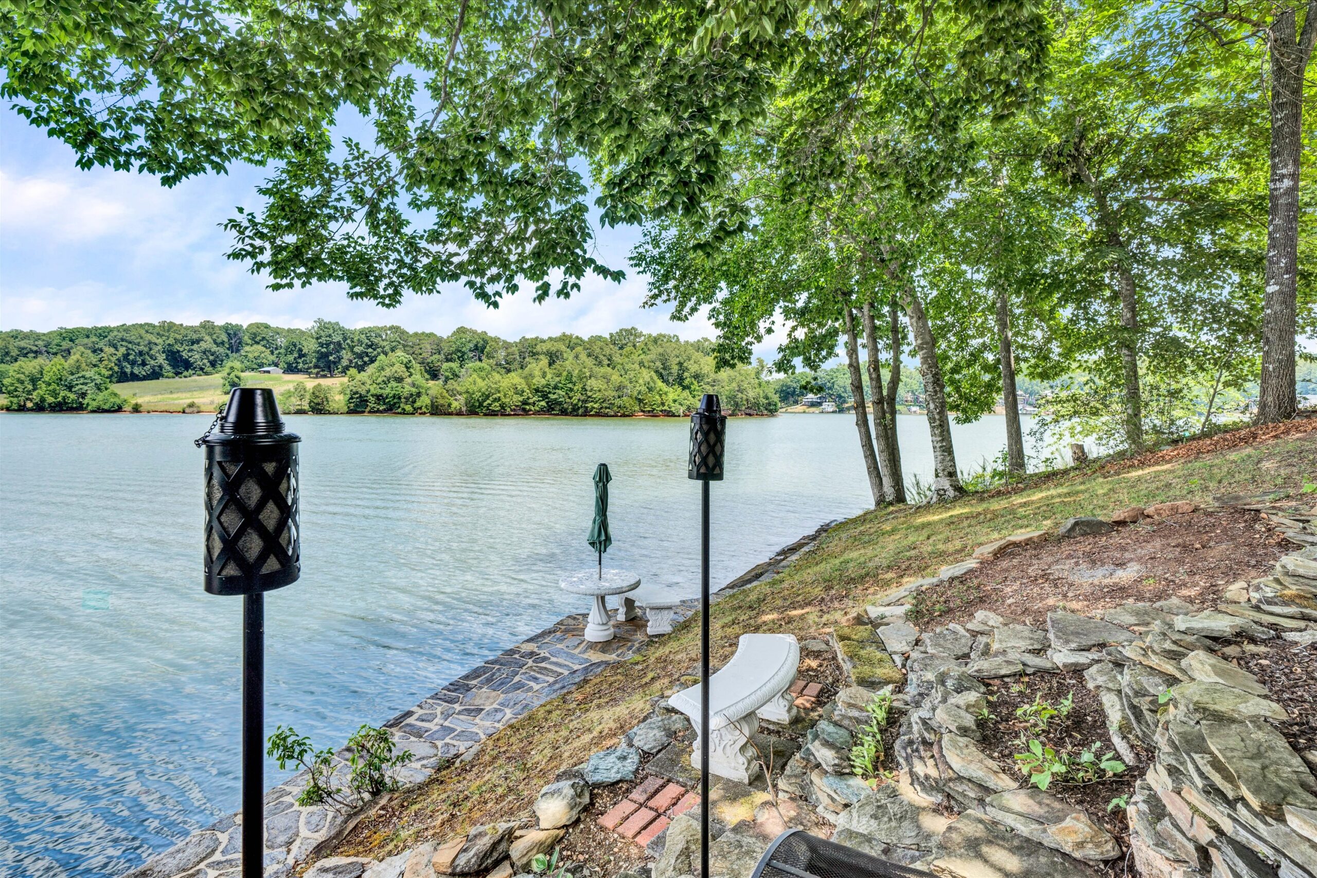 Conveniently located between Rocky Mount & Westlake, with wide views of the 4H Peninsula, this unique 3-level home was designed by Ralph Palmisano in 2000. Its classic Mediterranean lines are perfectly adapted to the hillside point lot & puts you close enough to the water to be startled by the sound of fish jumping or to see the shad & bluegills swarming as you lounge on one of its 4 decks. Shoreline features natural stone that abuts a man-made stone seawall constructed some 50 years ago by the original owners shortly after the lake was formed. Current owners purchased the property in 1993 & contracted Ben Perdue to build the boathouse, which was completed in 1996. Streetside, the house is located on a cul-de-sac in a small, close-knit community that has at least one neighborhood “Pig Pickin” every year & its 2 roads are county maintained, including plowing in winter. There is a concrete driveway leading to the attached 2-car garage & you don’t have to be a marathon athlete to walk to the end to get the mail.