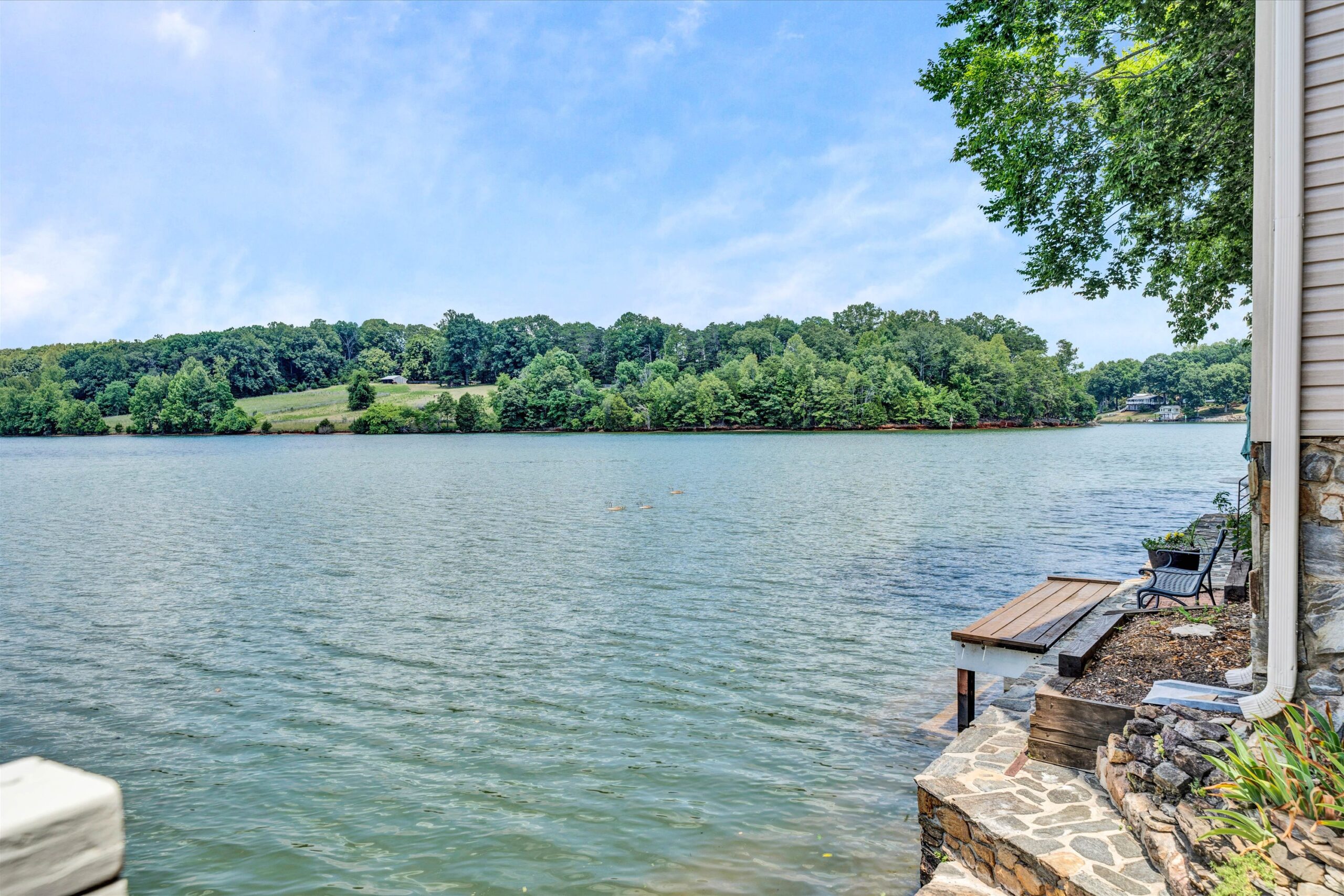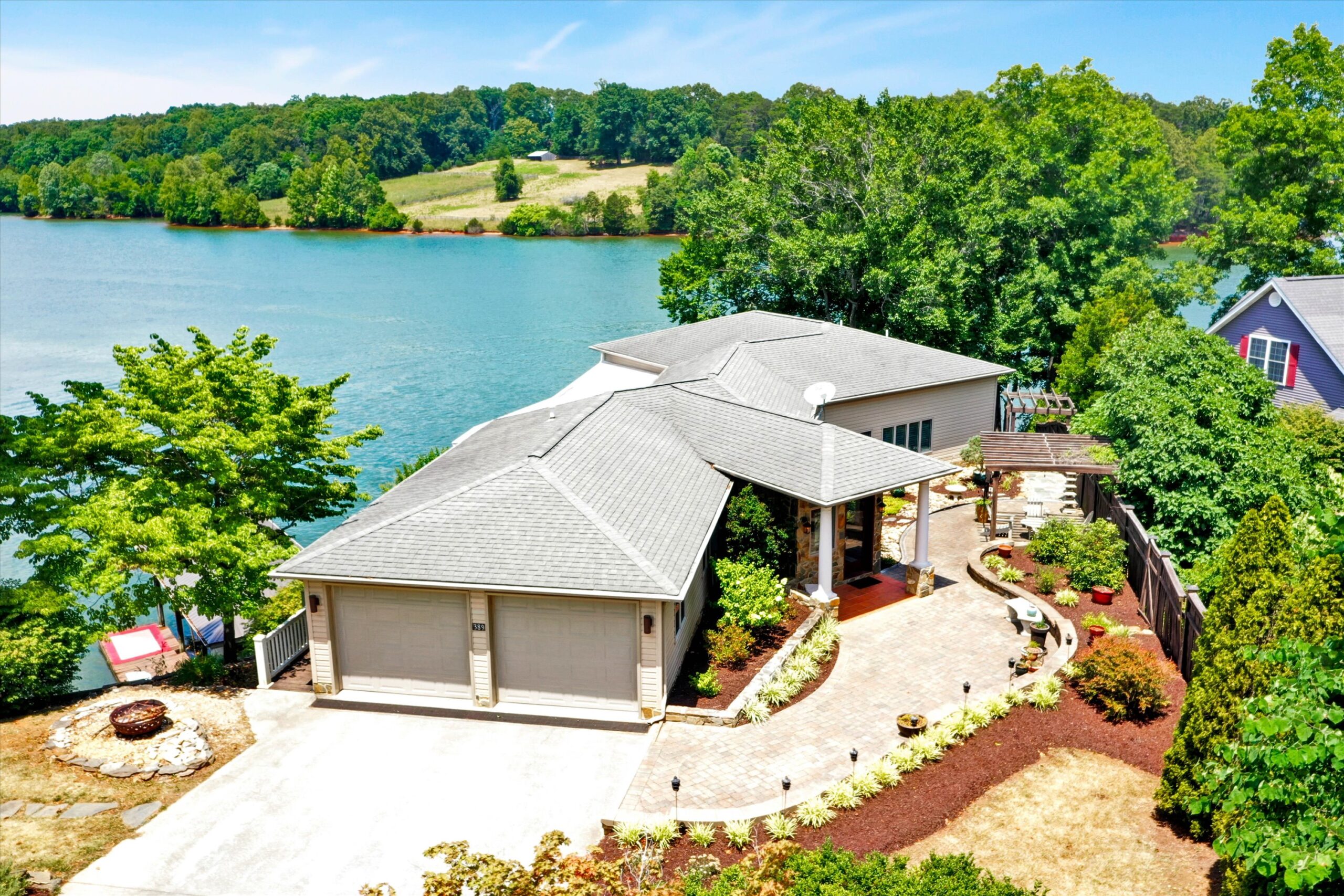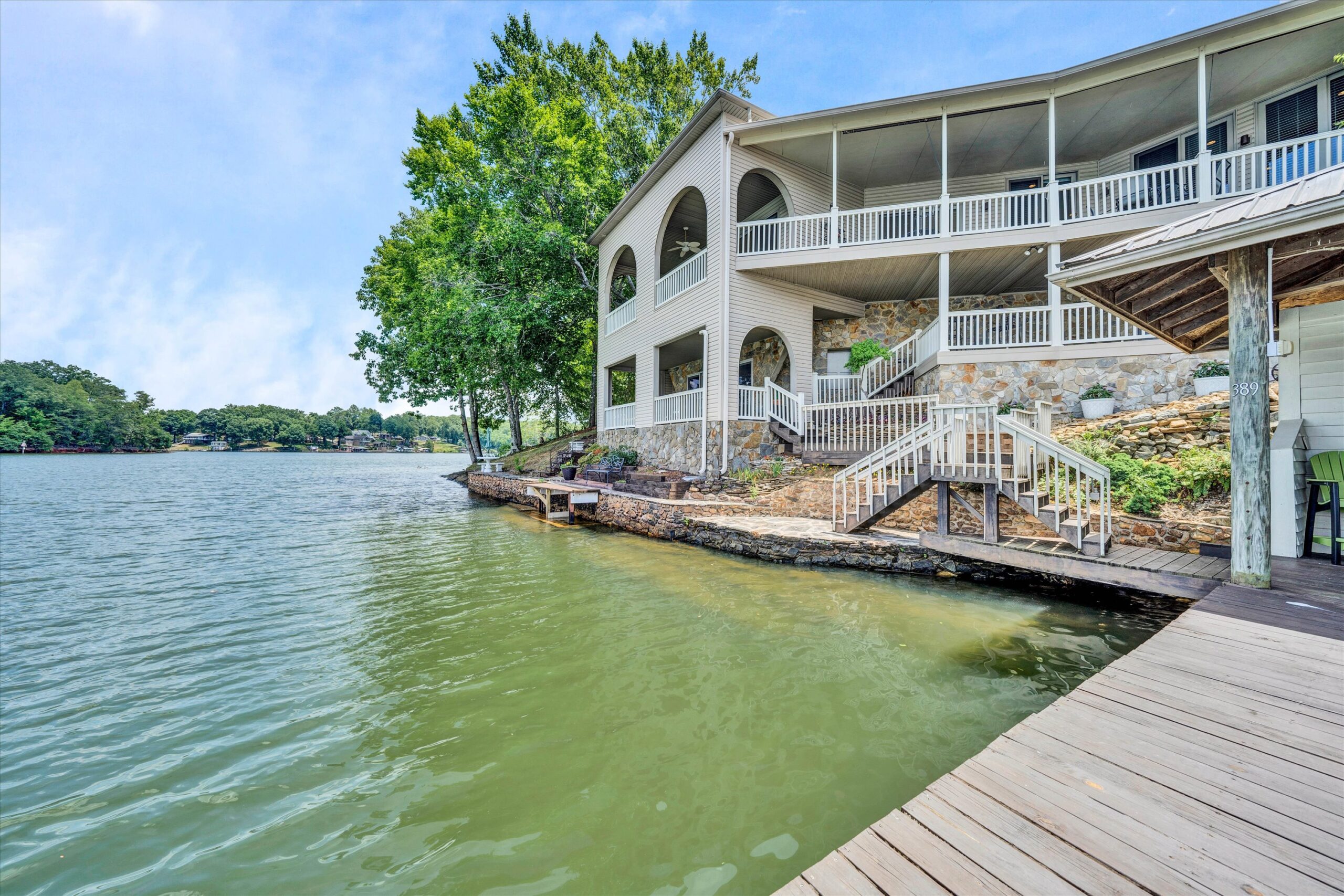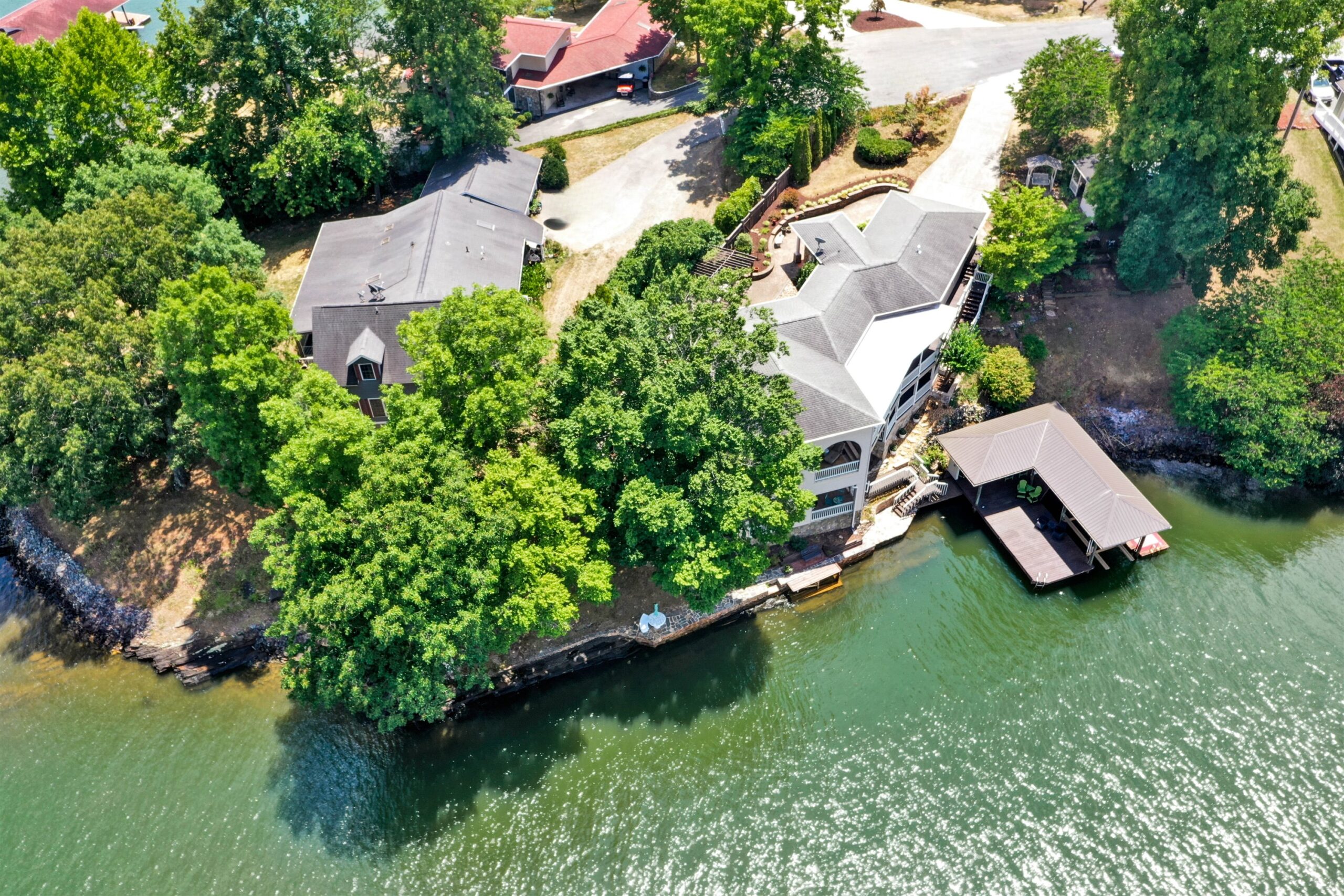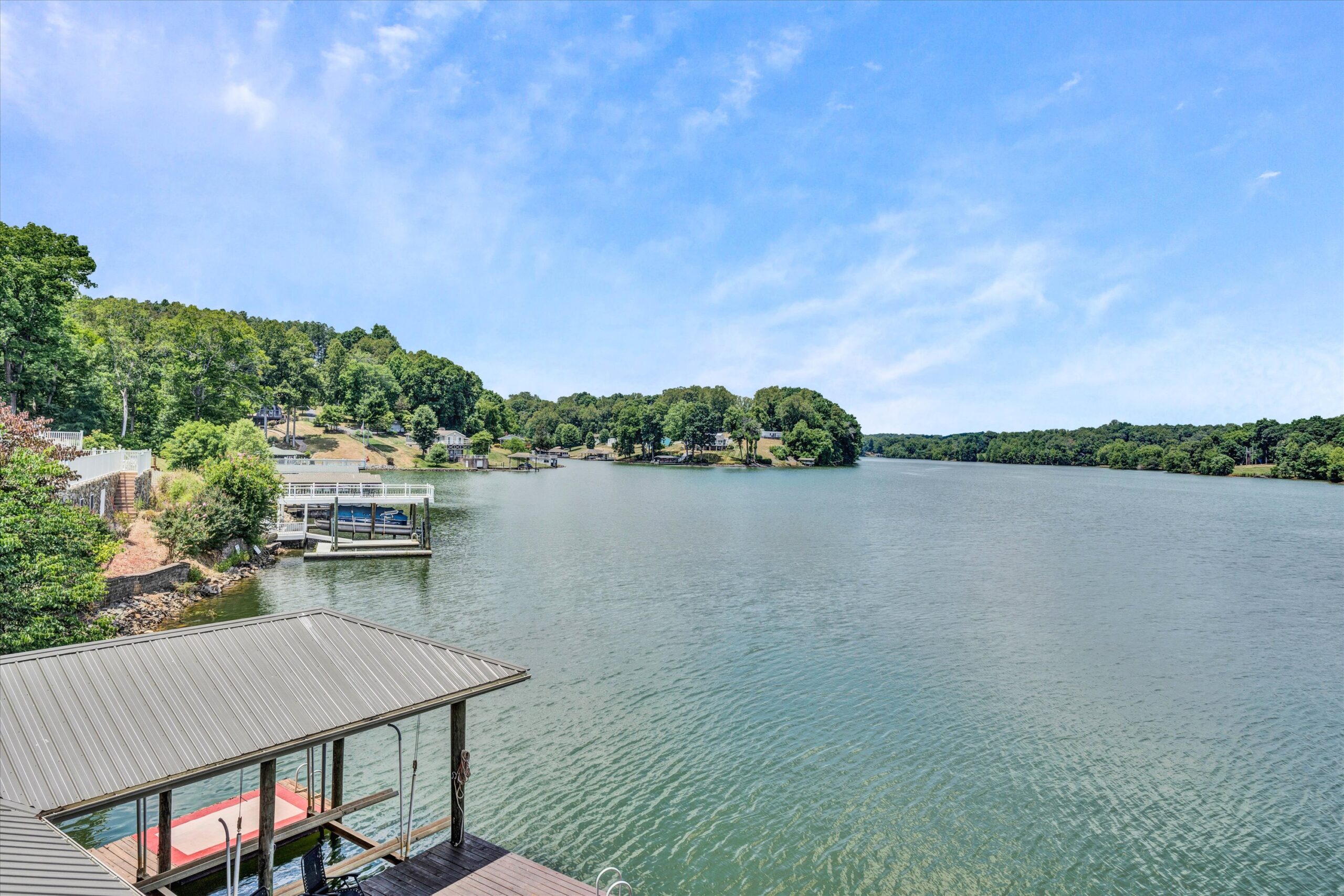 Conveniently located between Rocky Mount & Westlake, with wide views of the 4H Peninsula, this unique 3-level home was designed by Ralph Palmisano in 2000. Its classic Mediterranean lines are perfectly adapted to the hillside point lot & puts you close enough to the water to be startled by the sound of fish jumping or to see the shad & bluegills swarming as you lounge on one of its 4 decks. Shoreline features natural stone that abuts a man-made stone seawall constructed some 50 years ago by the original owners shortly after the lake was formed. Current owners purchased the property in 1993 & contracted Ben Perdue to build the boathouse, which was completed in 1996. Streetside, the house is located on a cul-de-sac in a small, close-knit community that has at least one neighborhood “Pig Pickin” every year & its 2 roads are county maintained, including plowing in winter. There is a concrete driveway leading to the attached 2-car garage & you don’t have to be a marathon athlete to walk to the end to get the mail.