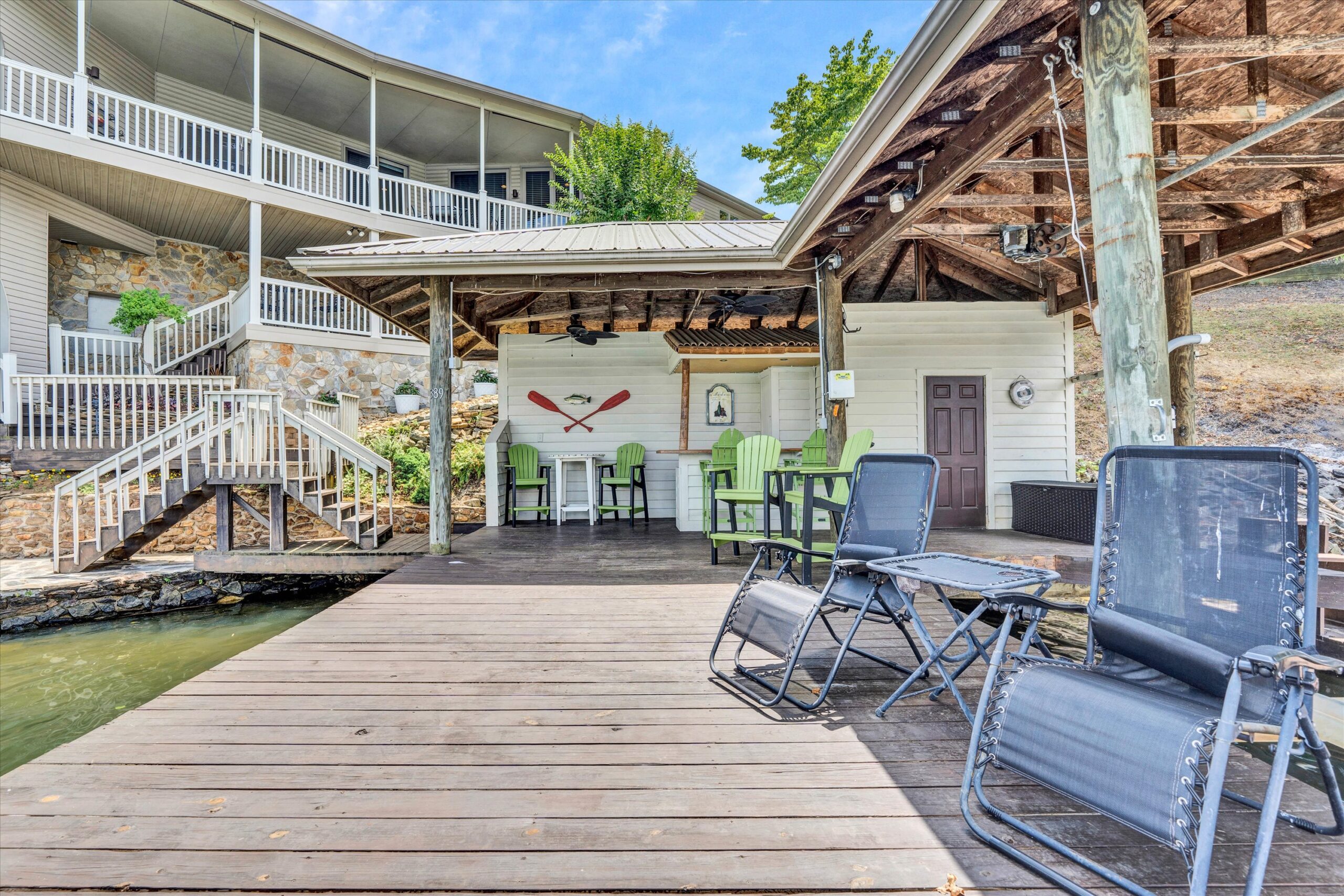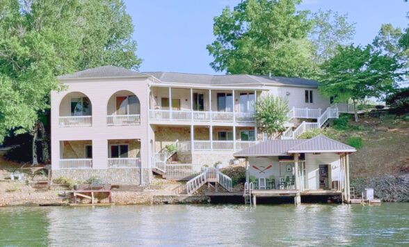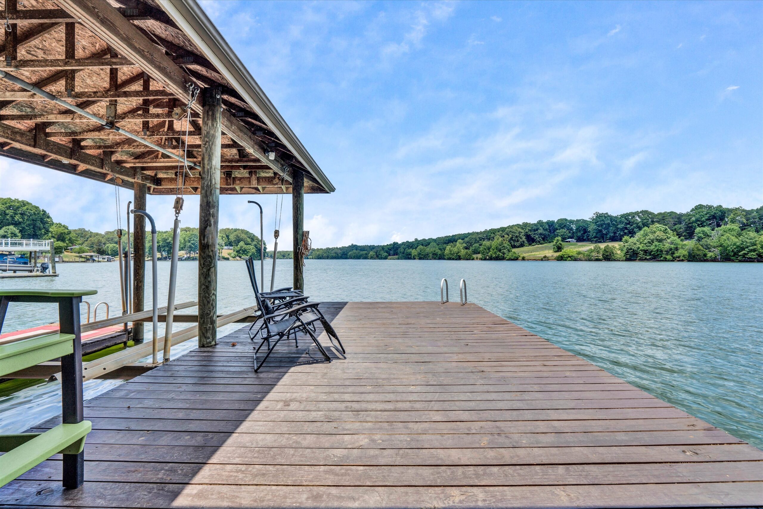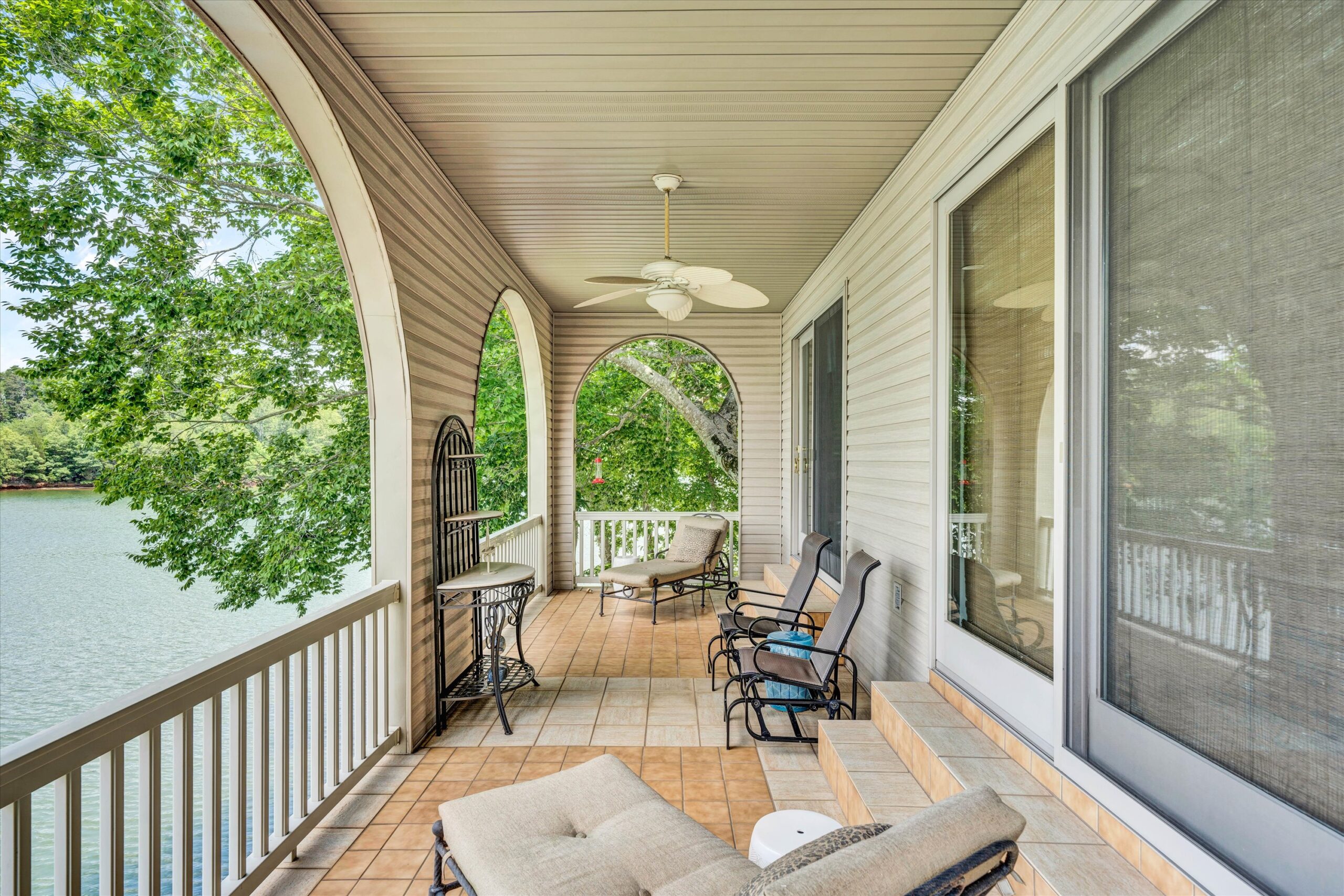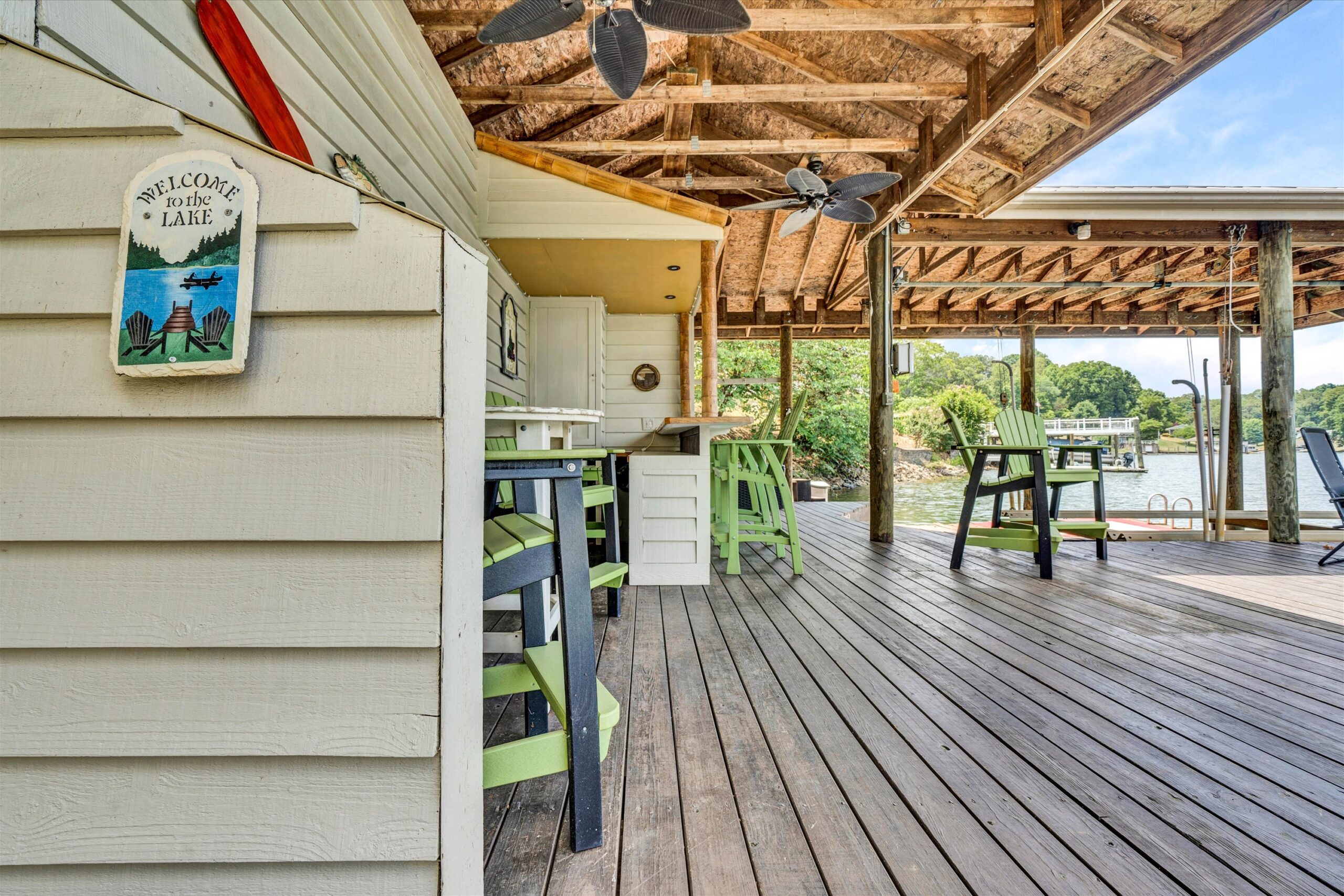 Conveniently located between Rocky Mount & Westlake, with wide views of the 4H Peninsula, this unique 3-level home was designed by Ralph Palmisano in 2000. Its classic Mediterranean lines are perfectly adapted to the hillside point lot & puts you close enough to the water to be startled by the sound of fish jumping or to see the shad & bluegills swarming as you lounge on one of its 4 decks. Shoreline features natural stone that abuts a man-made stone seawall constructed some 50 years ago by the original owners shortly after the lake was formed. Current owners purchased the property in 1993 & contracted Ben Perdue to build the boathouse, which was completed in 1996. Streetside, the house is located on a cul-de-sac in a small, close-knit community that has at least one neighborhood “Pig Pickin” every year & its 2 roads are county maintained, including plowing in winter. There is a concrete driveway leading to the attached 2-car garage & you don’t have to be a marathon athlete to walk to the end to get the mail.